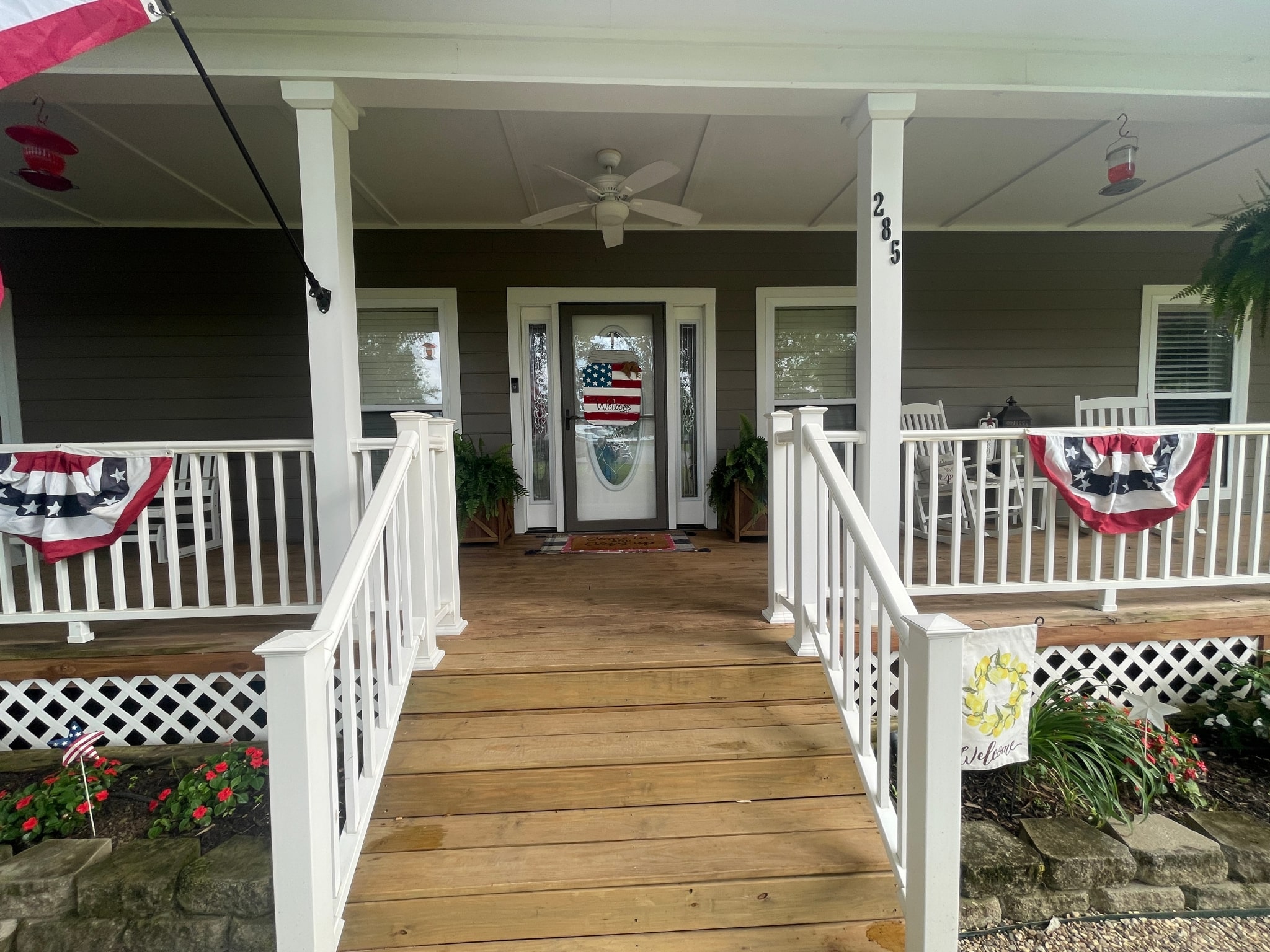 Outdoor Oasis: The expansive backyard boasts a well-maintained lawn and plenty of space for gardening or play. Front flower beds and hanging ferns are on an automatic watering system.