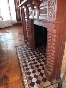 A main-floor flex room offers potential for a 5th bedroom, home office, or guest space. The home includes one full bathroom, recently renovated wraparound front porch and double-tiered rear decks, large side and back yards, and tandem parking for two. Recent updates include a new roof. Interior features original parquet hardwood floors, pocket doors, ceiling medallions, and an original tiled fireplace.